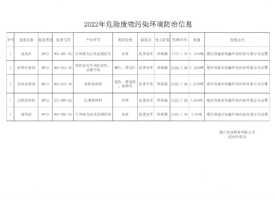 无极药业有限公司2022年危险废物污染环境防治信息