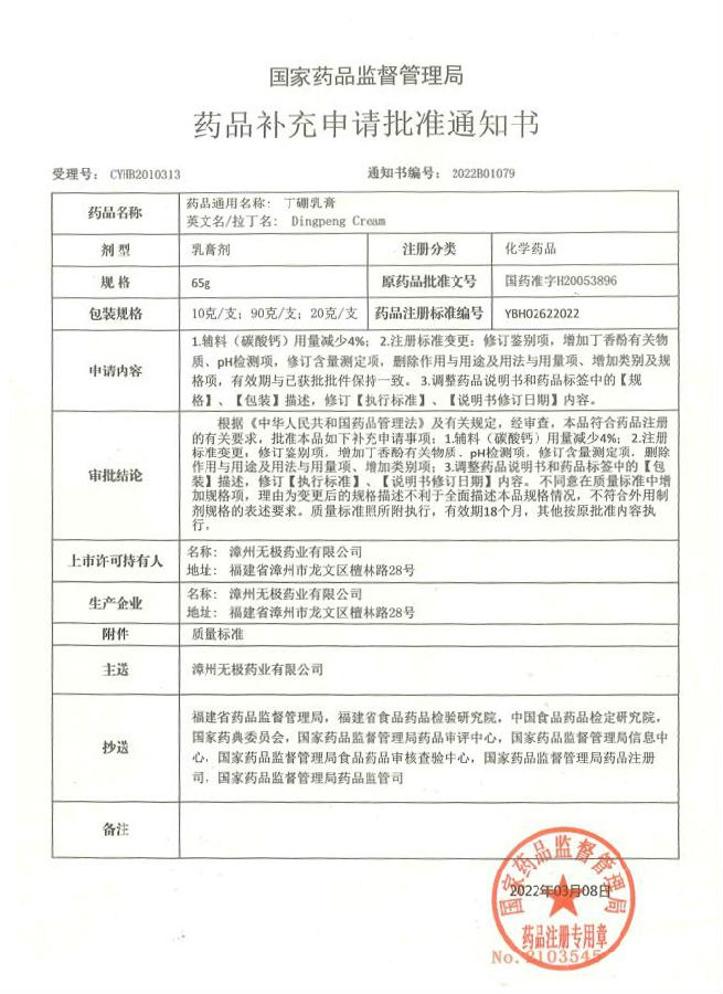 2018年9月无极公司启动丁硼乳膏质量提升工作,在技术中心、质量管理部、生产部等部门与北京CRO公司的通力协作下,历时3年多,经过实验室小试、中试、商业批次放大生产以及产品的稳定性考察、资料申报各个环节,无极公司于2022年3月8日收到国家药品监督管理局药品补充申请批准通知书,丁硼乳膏质量提升补充申请正式获得国家药监局批准。