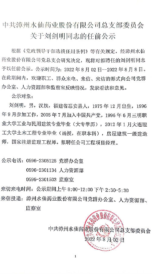关于刘剑明同志的任前公示