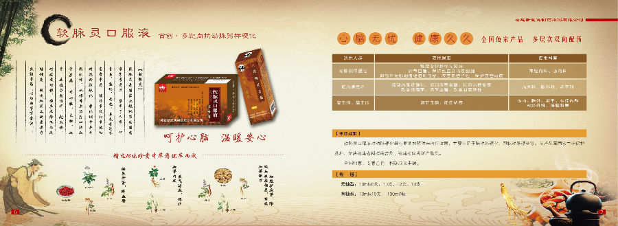 公司产品以心脑血管药物、呼吸系统药物为主导,形成以软脉灵口服液、满山白糖浆、眠安宁合剂等18个品种(附药品注册证明细表),其中全国独家剂型产品“眠安宁合剂、满山白胶囊、满山白颗粒、满山白片”及独家产品“软脉灵口服液、桂茸固本丸”;我司独创产品软脉灵口服液曾属国家中药保护品种,荣获全国科学大会奖、中国中药名牌产品、省部级优质产品奖、优秀新产品奖等众多荣誉。